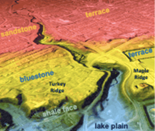The Gorge was initially carved by a glacial advance more than 20,000 years ago. This glacial activity created two Bluestone Shale terraces (“Turkey Ridge” to the north and “Maple Ridge” to the south). The gorge, or ravine, emerged as the Doan Brook continued to carve between the two terraces as it flowed toward Lake Erie.