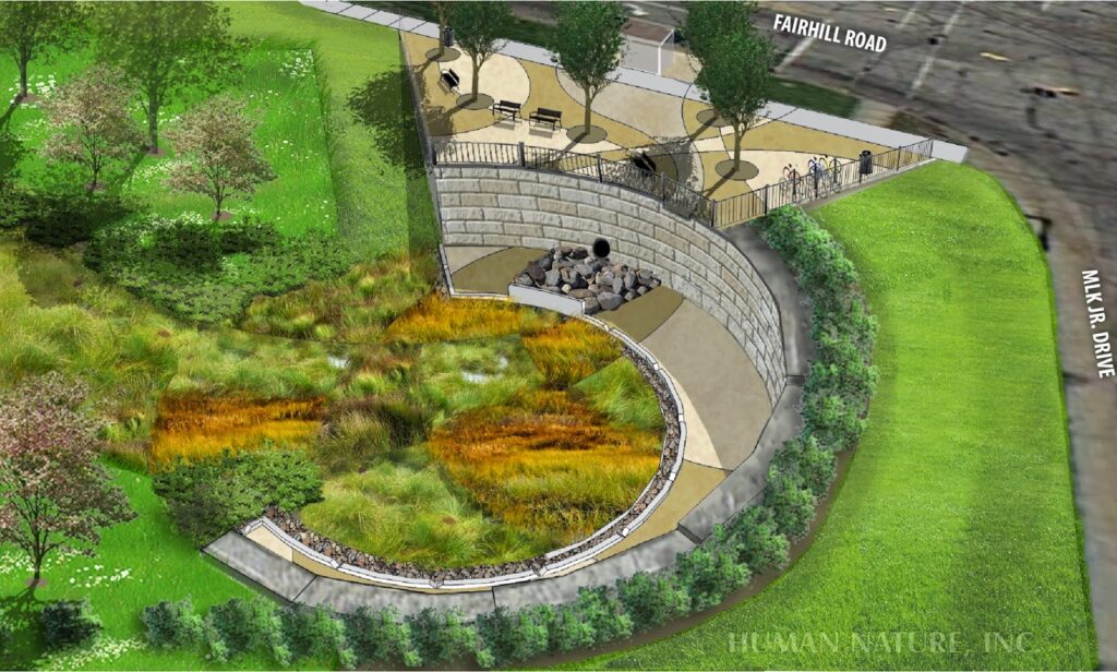 In 2016 the Northeast Ohio Regional Sewer District developed a storm water retention basin and native plant “bioswale” at the corner of Fairhill Rd. and MLK Jr. Dr. – uphill from the Gorge and near the trailhead above the MLK culvert. This work may be seen as the start of a beautification of the Gorge environs.